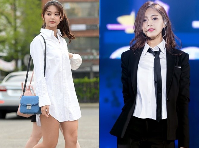 條紋襯衫也是韓妞人手一件的必備款,但是如果不想跟大家長得很像的話,可以挑選像是周子瑜這款設計較特別的款式,性感又不失可愛,也不易跟別人撞衫。