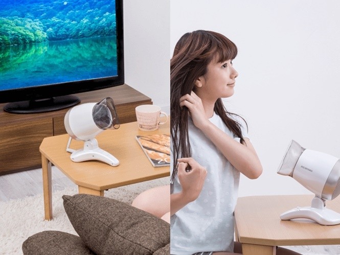這款「桌上型吹風機」來自於日本家電品牌「IRIS OHYAMA」,將吹風機加裝了底座的設計,讓它能夠固定在平面上,只要坐在吹風機前,雙手撥撥頭髮、輕鬆的整理,就能毫不費力氣的將頭髮吹乾。