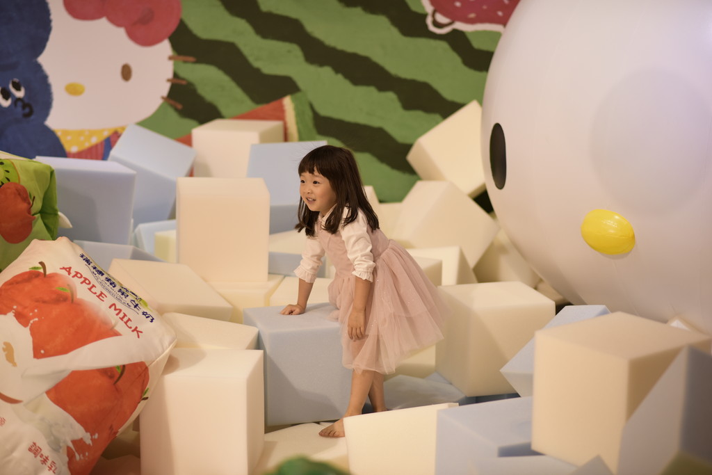 「Hello Kitty水果樂園冰塊池」則有超大型冰塊水果軟墊池,跑跳超療癒,還能拍下歡樂瞬間,來到另外還有用大型蘋果抱枕,幫Hello Kitty測量身高體重的「Kitty知多少?!」,甚至還能直擊「設計中心」,看到歷年6套人偶服裝櫥窗以及20款歷年Hello Kitty經典的蝴蝶結牆,其中最吸睛的當然是由1000顆線軸組合而成的Hello Kitty縫紉牆,任何角度都很有梗。