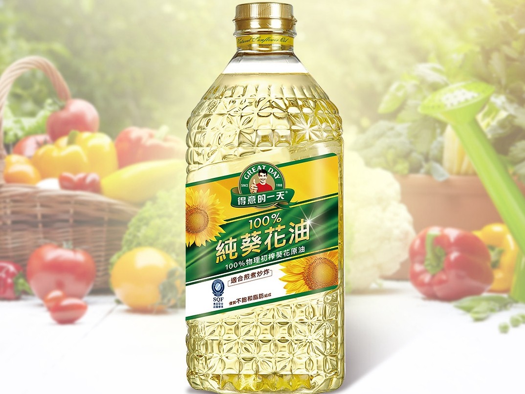 得意的一天100%葵花油是精選歐洲葵花種籽,透過100%物理壓榨的初榨原油,所謂物理壓榨法,是將原料經精選、清洗、浸潤、去皮、破碎、加熱後,以壓榨機直接壓榨使油流出,金黃清澈的顏色則是運用多重專業精煉技術,讓油質純淨透亮、清澈不混濁。