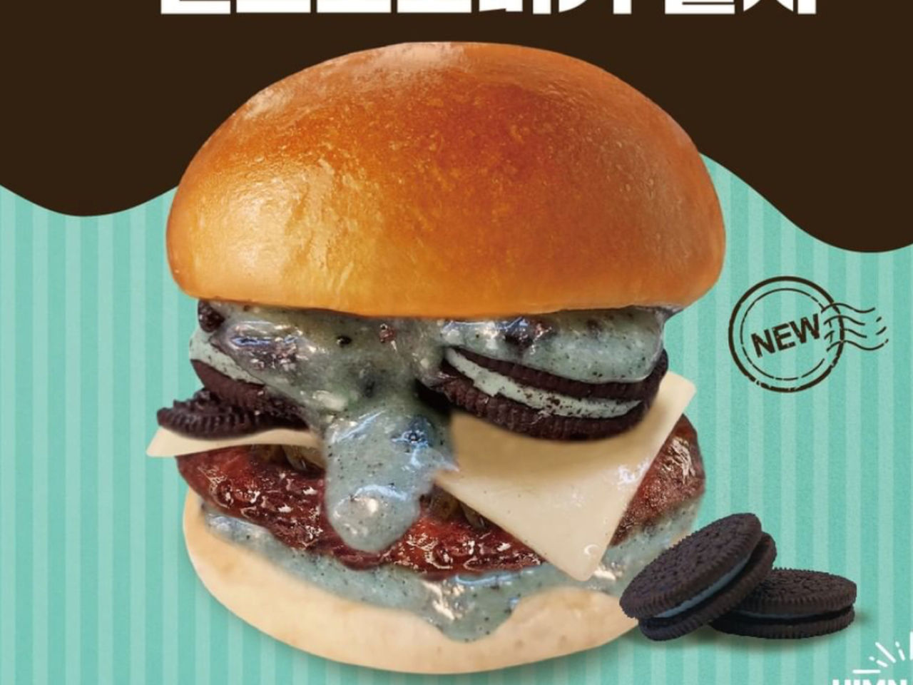 韓速食品牌「Himnanda Burger」以健康漢堡為特色,最近推出了一款薄荷巧克力口味漢堡,無論是外觀或是口味都帶來巨大衝擊,金黃麵包外皮內,夾著豐富餡料,包括巧克力奧利奧餅乾、帶有活性乳酸菌的起司片,下方則有厚實多汁的牛肉漢堡排,光是鹹甜交錯還不夠,充分淋上藍色的醬汁相當搶戲,是以薄荷製成,帶來沁涼口感。