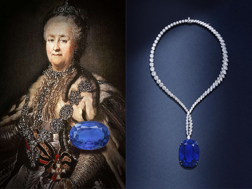 此傳奇藍寶石於260年前在斯里蘭卡被發現,據傳當時想追求凱薩琳的荷蘭公爵費盡千辛萬苦,將此藍寶石送到俄羅斯送給她,正是Netflix影集《凱薩琳大帝 The Great》中皇室珠寶的真實原型。一百多年後此寶石被海瑞溫斯頓買下,在1949年「珠寶宮」(The Court of Jewels)的巡迴展覽中,即展出此碩大藍寶石,當時與大名鼎鼎的「希望之鑽」(Hope)、「東方之星」(Star of the East)等名鑽並列。