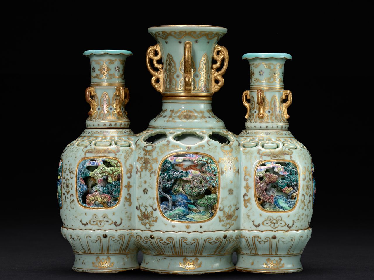香港蘇富比11月上拍的清乾隆御製洋彩粉青地描金內狩獵圖三元轉旋瓶,是景德鎮御窰廠督陶官唐英鞠躬盡瘁獻給乾隆皇帝的告別之作,罕見將三瓶合一,描繪皇家狩獵圖,只要旋轉外瓶頸,內部機械結構連動會讓3個內瓶轉動,皇子們追趕獵物的模樣生動上演,精巧且難得之作估價逾2億元。