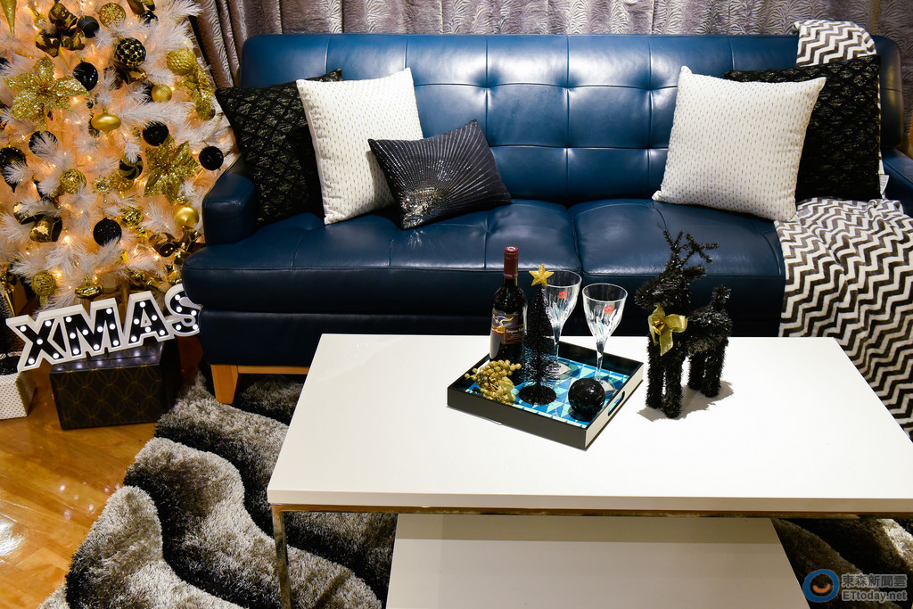 ▲客廳聖誕風佈置可掌握流行時尚的黑、白、金配色,加上秋冬居家主流色孔雀藍、綠妝點,以華麗聖誕樹展現聖誕風格生活美學。
