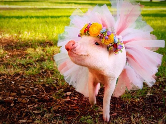 ▲粉色迷你小豬Hammy穿上主人親手製作的蓬蓬裙,再配戴上小清新花環,讓Hammy不僅可愛還更淑女了。(圖/翻攝自hamlet_the_piggy Instagram)