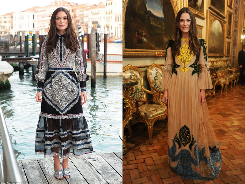 日前,英國服裝品牌Erdem 與 Mytheresa.com購物網站在威尼斯合辦晚宴,綺拉奈特莉受邀出席,身穿一襲Erdem2016秋冬款式的古典洋裝,帶有透明感的蕾絲天鵝絨洋裝,剪裁線條及綺拉奈特莉本人的表情都極具個性,予人強烈且深刻的印象。