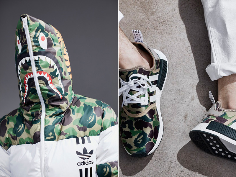 鞋款部份,愛迪達明星級NMD成為BAPE聯名的主打鞋款,有綠色及黑灰二大迷彩選色。