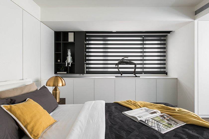 同樣純淨調性進入主臥,設計反其道而行將遮擋採光的更衣間拆除,但收納效能不僅一樣強大,甚而以大片純白櫃牆的新角色,與特選的防蟻紅木地板形塑出明和日麗的溫暖清新,一派的悠然愜意在此畫下讚嘆不已的完美句點。