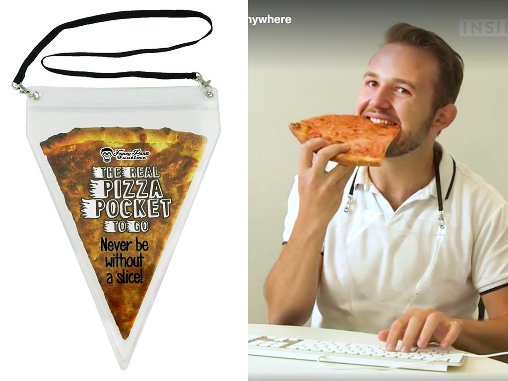 在亞馬遜購物網站販售的「外帶披薩袋」,標榜是「披薩狂」的完美禮物,13x9公分的尺寸,正好能裝下標準的「一片披薩」大小,能拉起拉鍊、掛在脖子上,隨時想吃就可以拿起來解解嘴饞,還能夠洗滌、重複使用,聽起來真的挺夢幻。