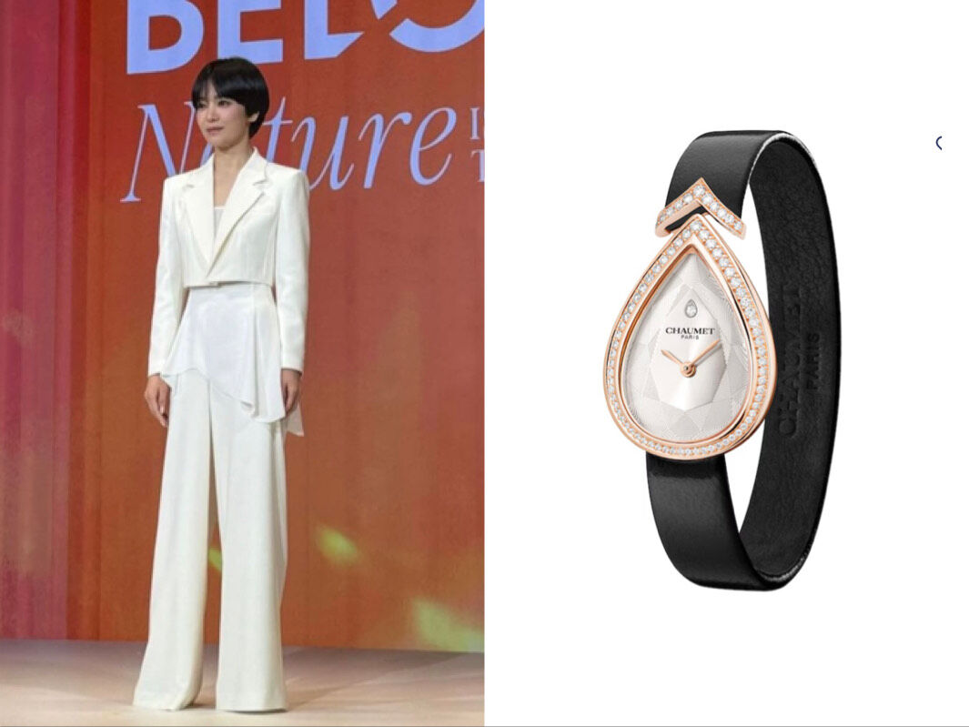 宋慧喬於 BELOTERO 活動上,身穿MICHAA白色短版外套配寬褲,帥氣中帶著優雅氣息,手腕間則閃耀CHAUMET靈感源自約瑟芬皇后的Joséphine Aigrette鑽錶,水滴造型錶殼搭配經典鷺羽「V」字造型風格大氣,她特別換上紅色錶帶更加吸睛。