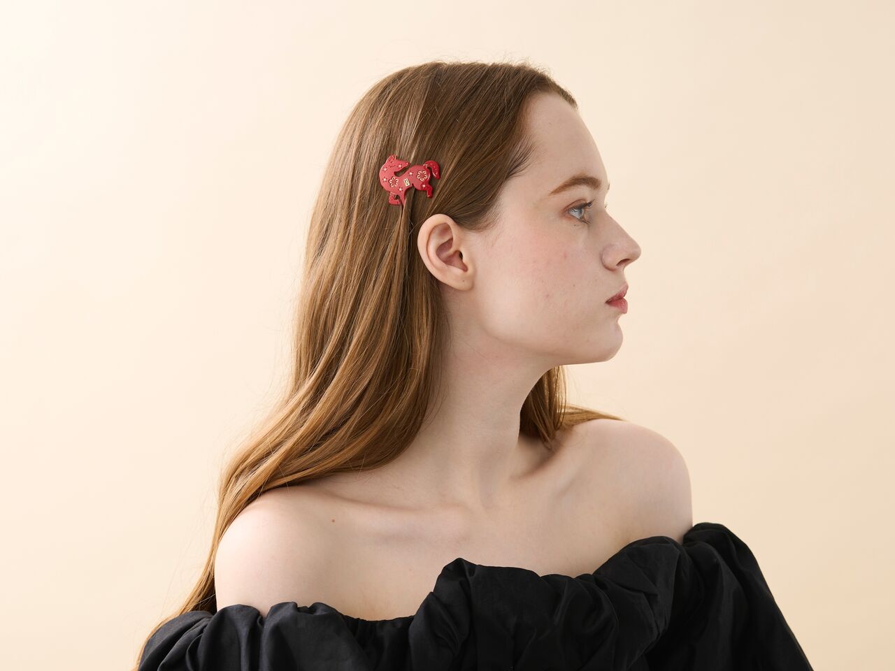 亞歷山卓以「馬踏花開」為名的賀歲髮飾,結合馬年象徵的前進力量與花朵盛放的喜慶寓意,立體紅色馬型輪廓搭配金色描邊與花卉裝飾,呈現動感與柔美並存的設計美感,共有豆扣夾與髮束款式;「花團錦簇」系列則以層層綻放的花朵為設計靈感,運用施華洛世奇珍珠、水晶與高級醋酸纖維材質,堆疊出宛如繁花盛開的華麗景致,配色涵蓋經典紅、沉穩黑與柔和金,無論正式宴會或節慶造型,都能展現如同髮上珠寶般的精緻魅力。