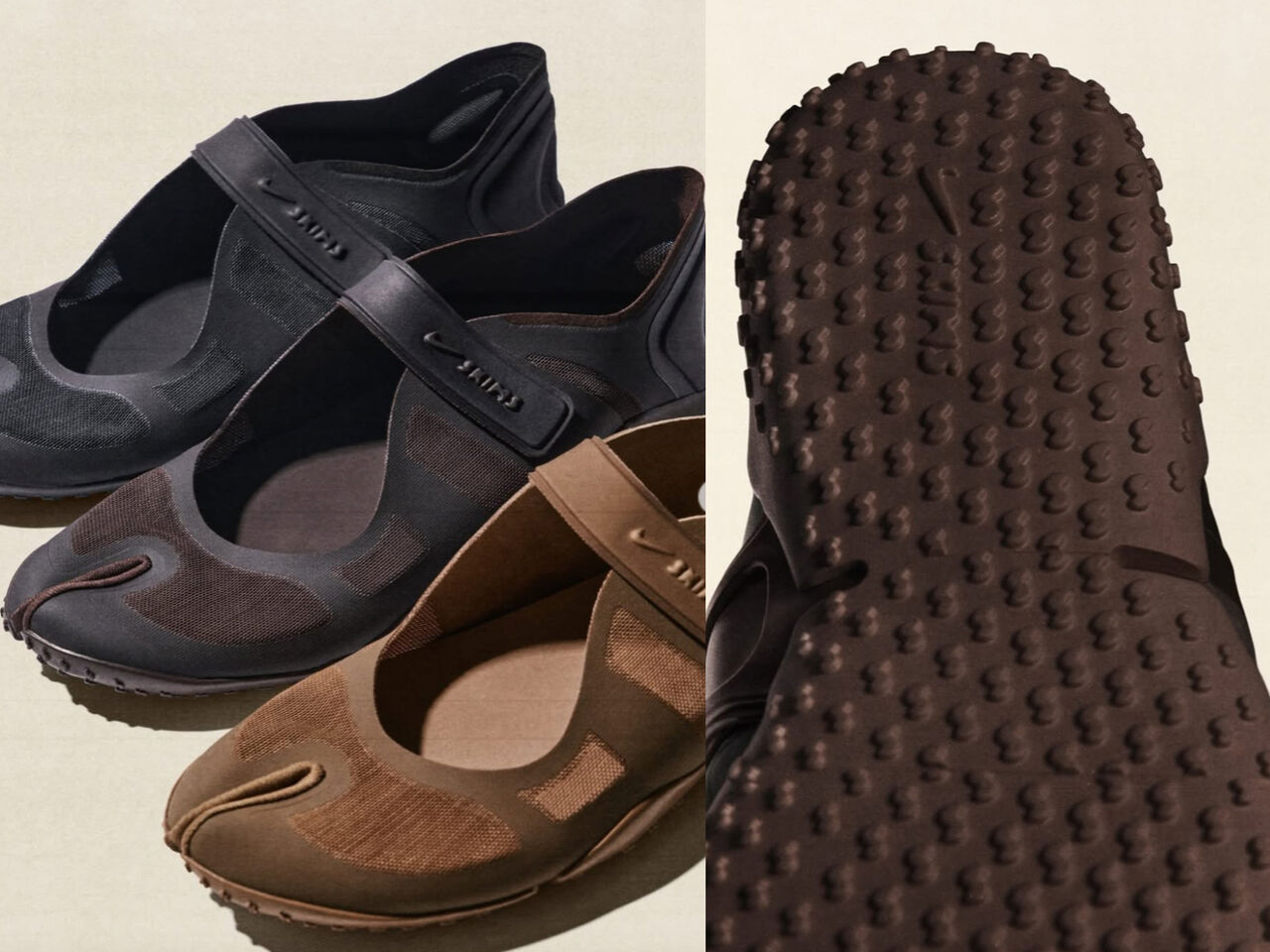 此次亮相的 NikeSKIMS Mesh Rift,以 Nike 經典的分趾鞋型 Rift 為基礎重新演繹,保留標誌性的 split-toe 輪廓,並透過更貼合女性足型的比例調整與 Mesh 網眼材質,打造兼具機能性與造型感的全新樣貌。鞋身線條流暢俐落,結合彈性織物與包覆結構,在舒適度與時尚感之間取得平衡,也呼應 SKIMS 一貫強調「貼合身形」的設計核心,而且鞋底也充滿巧思,將雙方Logo呈現在足下。在配色上,NikeSKIMS Mesh Rift 共推出三款色選,包括經典 Black 黑色、溫潤柔和的 Velvet Brown 天鵝絨棕,以及帶有大地氣息的 Archaeo Brown 棕色,低調卻富層次的色調設定,讓鞋款能輕鬆融入日常穿搭,也進一步模糊運動鞋與時裝鞋之間的界線。