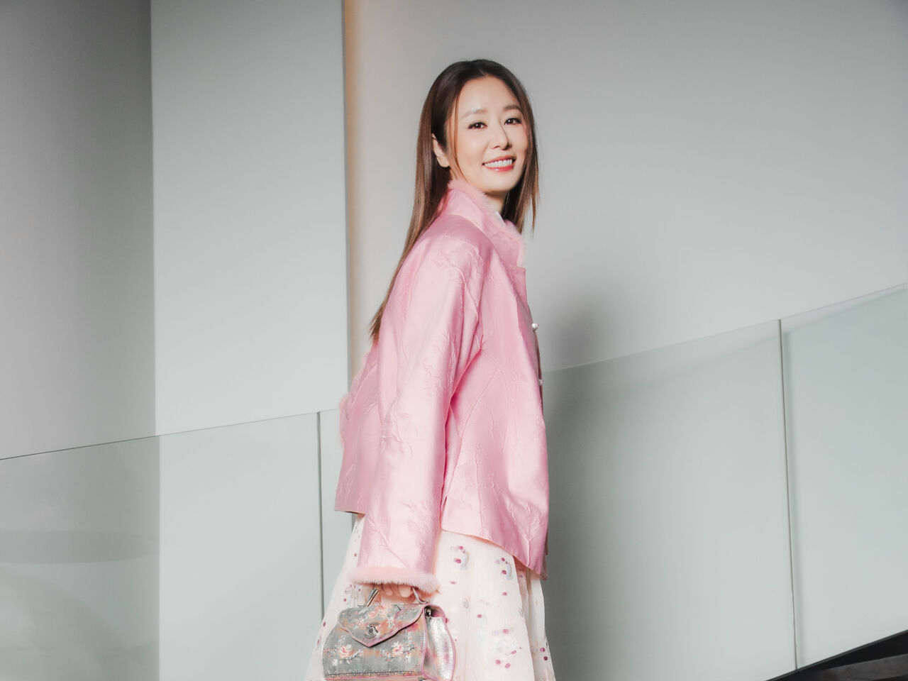 本次林心如穿搭主打粉色立領緹花棉襖外套,結合貂毛立領與玉石釦細節,以中式線裝書為靈感,復刻中式年節穿著記憶,搭配綻放東方花卉的開版緹花長裙,以優雅柔美姿態展現新春氛圍。鞋履則以銀白色短靴搭配中跟設計,營造出洗鍊俐落的姿態,兼具過年走春的實穿性與儀式感。手上搭配的是銀灰色刺繡手提包,整體造型融合東方古典與現代女性姿態,呼應品牌此次以「記憶」為主題的設計理念。