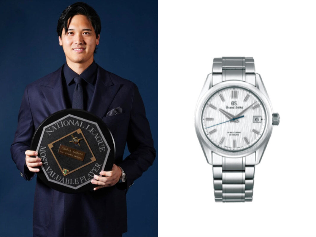 ▲大谷翔平領取國聯年度MVP獎,佩戴Grand Seiko靈感源自白樺樹的Evolution 9系列SLGH005腕錶,270,000元。(圖/翻攝mlbjapan IG)