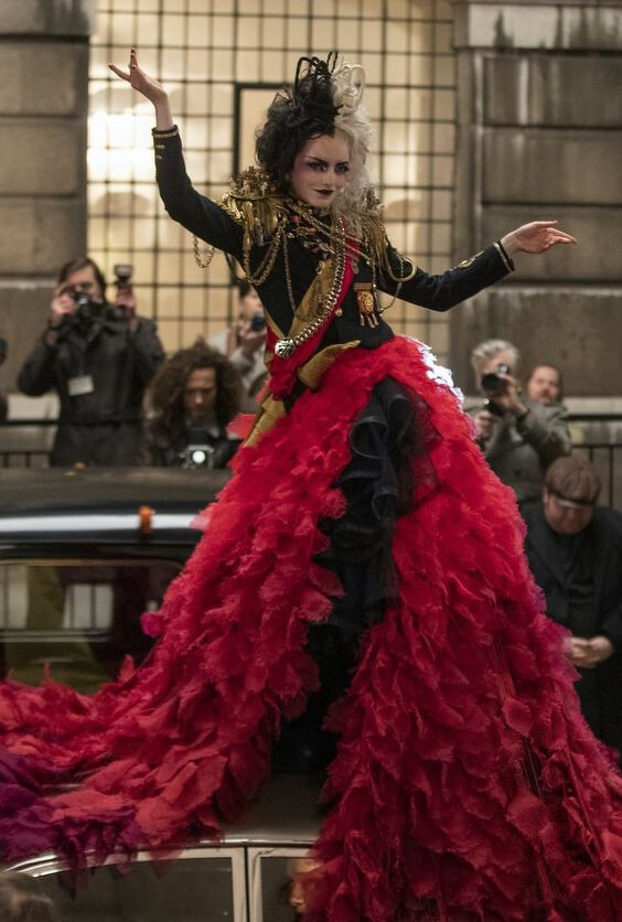 順帶一提,這套奇幻獵奇的軍裝混搭寬大長裙,有皇室般高高在上的奢華氣息也有如「Sex Pistols」樂團直接了當的英倫龐克,當然,對時裝有了解的朋友會知道這套造型的呈現不會是一個簡單的工程,劇中設計師為了讓 Cruella 能夠自然擺動大裙襬,展現女王特質,以及表達裙裝的自然垂墜感,造型團隊運用高達 5000 多片的花瓣,讓這套造型更具層次。