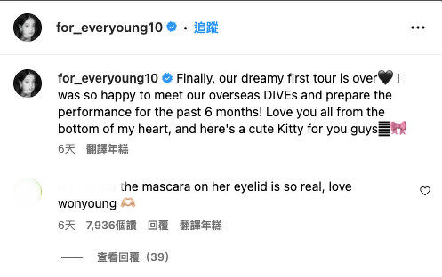 近期她在IG上PO出美照,第一張就是超近特寫,根根分明的睫毛、水潤的雙唇加上臉頰上可愛的Hello Kitty貼紙,讓粉絲們紛紛被電暈!不過這幾張照片卻引發了另一個話題,照片上張員瑛的上眼皮有著灰灰的小點,被網友認為是睫毛膏沾染,留言表示:「好真實」,不過負責的化妝師很快就出面說明,那些小小的點點不是睫毛膏,而是亮片,因為拍攝角度、光線等等因素,加上面積較細碎,才會看起來像是睫毛膏。