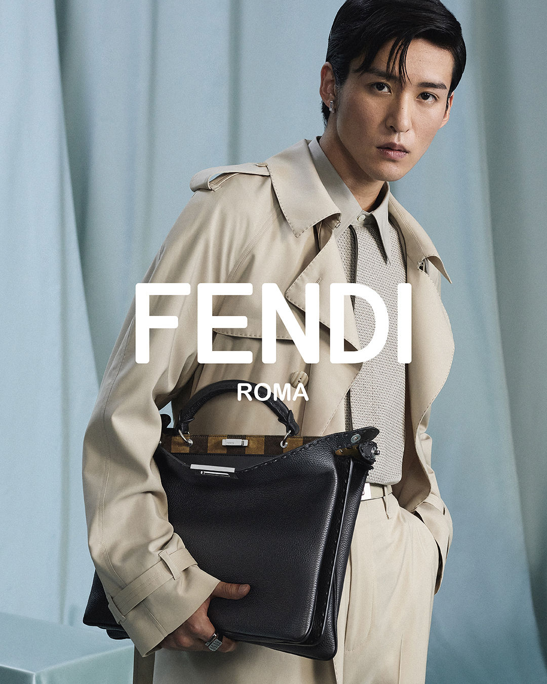 此外,日本男星目黑蓮身兼FENDI 全球男裝大使,近日登上全新 2025 春夏男裝系列廣告,他個人的紳士氣息與品牌不謀而合,這回頂著一頭俐落的旁分髮型,目黑蓮換上剪裁俐落的風衣疊搭翻領襯衫,不對稱的露肩針織衫露出緊實肌肉,彰顯一貫的率性氛圍。而他也演繹了學院風的針織背心單品,手拿FENDI Crest 紋章盾牌圖案的Peekaboo ISeeU Soft 包款,明亮色彩呼應出對春夏時節的渴望。