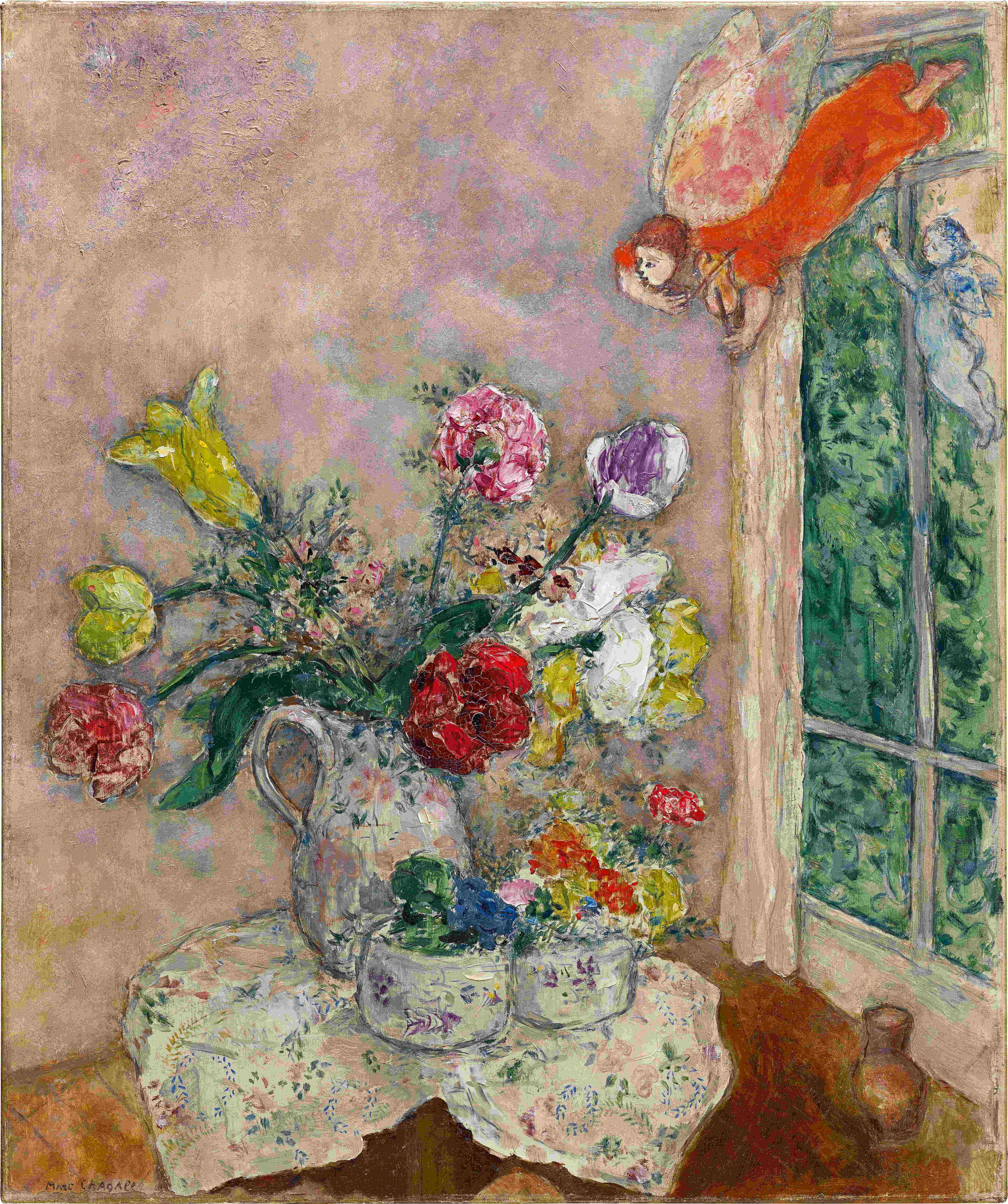 ▲馬克夏卡爾1930年《瓶承春華》油畫登上蘇富比拍賣,估價約93,245,000元起。