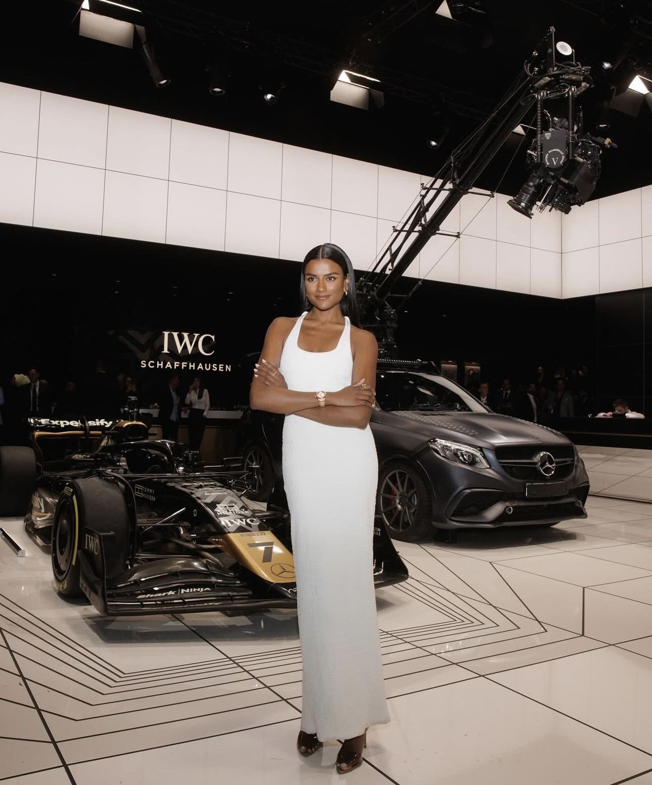 ▲英國女星女星西蒙艾希莉現身IWC展館,她身後是布萊德彼特賽車電影《F1》中的道具賽車。(圖/翻攝simoneashley IG)