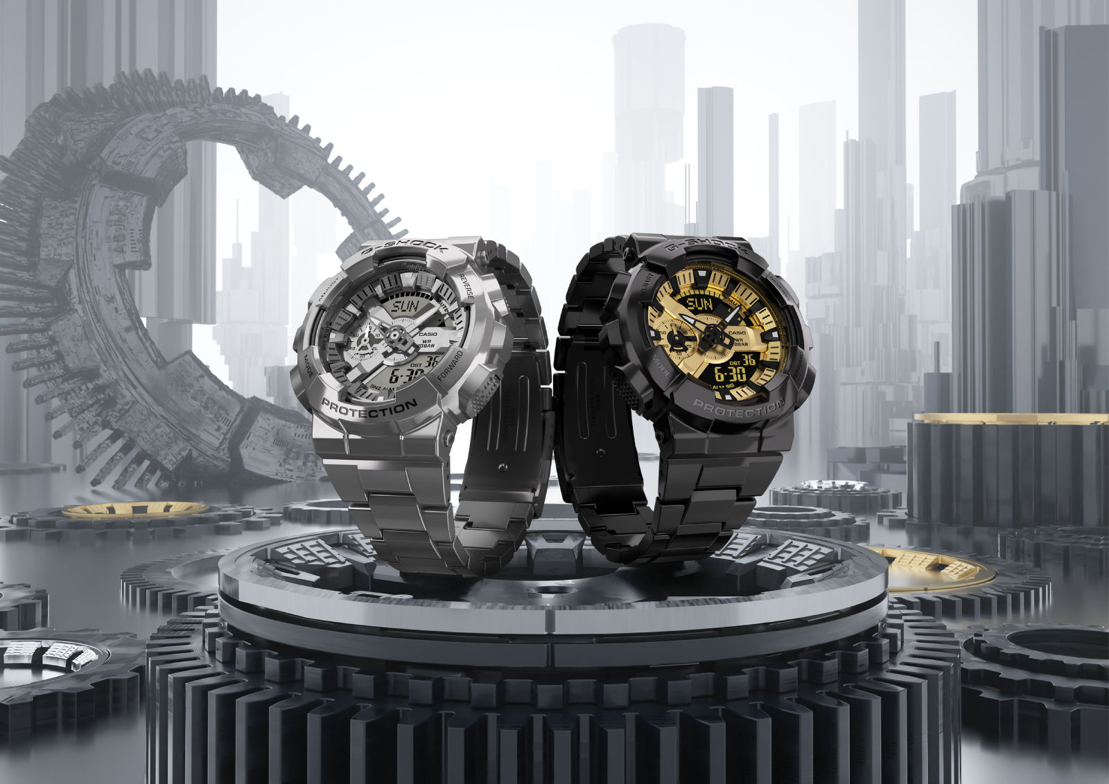 CASIO旗下G-SHOCK 110系列腕錶,以錶徑超過50毫米的超大尺寸著稱,霸氣設計人氣居高不下,今年新作首度導入金屬錶圈與金屬錶帶,打造GM-110D與GM-110BD兩款腕錶,其錶圈金屬部分經過精密鍛造、切割、拋光等多道工序,呈現複雜立體的結構造型,而面盤也呈現層層堆疊的立體效果,搭配重新設計的立體數字時標,並採用鏡面加工與切削紋理,在光影變化之下展現深邃的視覺效果。