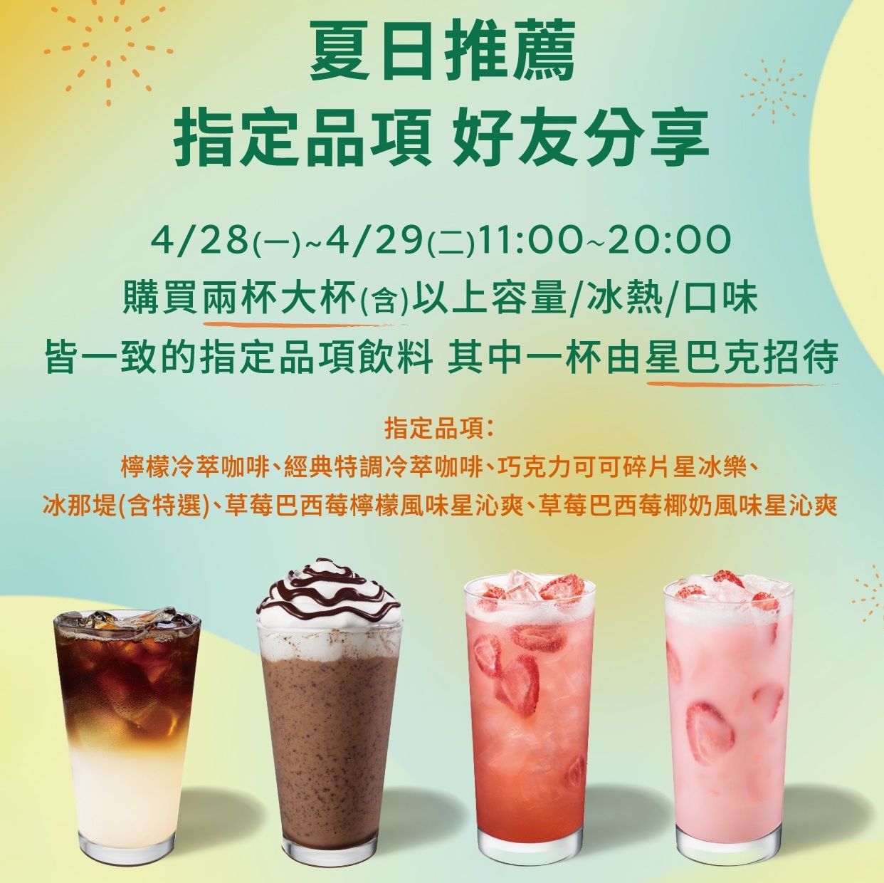 星巴克4/28、4/29連續兩天推出「夏日推薦 指定品項 好友分享日」優惠,期間從上午11點起至晚上8點,消費者至店購買指定7款冰飲,兩杯大杯以上容量、冰熱、口味皆一致的指定品項飲料,其中一杯由星巴克招待。每人每次至多買二送二,飲料限當場一次領取。