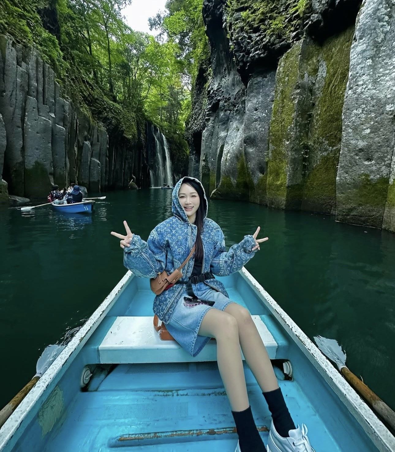 ▲到高千穗峽划船時,陳喬恩穿LV外套搭配愛馬仕Kelly Moov跨肩背包。(圖/翻攝iam_joechen IG)