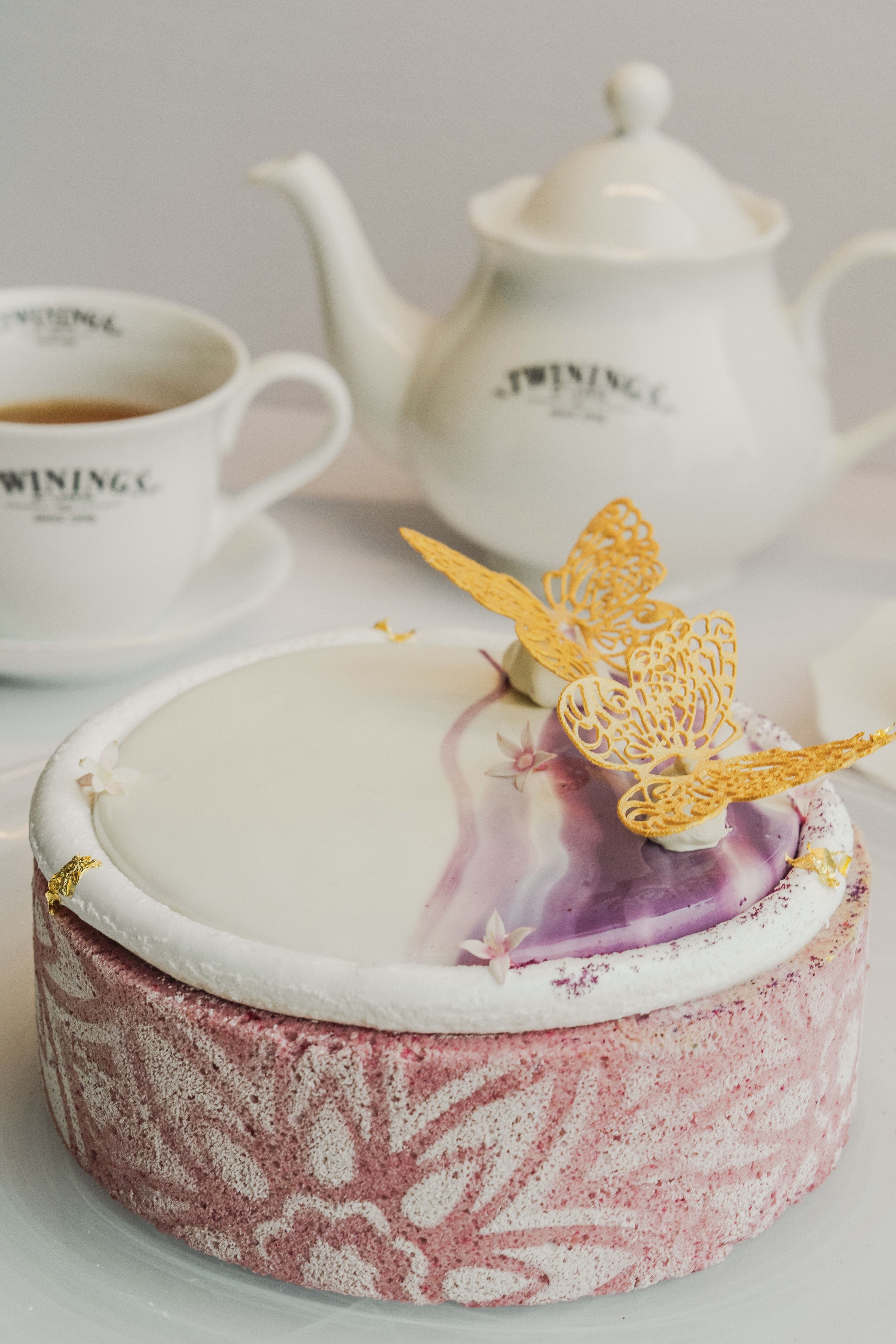 高雄承憶文旅「慕紫Violet」蛋糕,以紫芋泥與唐寧伯爵茶慕斯為主體,搭配琥珀焦糖茶奶凍與紫薯蛋糕,營造出柔軟綿密的口感。蛋糕外型呈現紫白漸層鏡面,靈感來自早期母親們手作的芋泥布丁蛋糕,象徵深層的親情記憶與情感告白,售價1,080元。