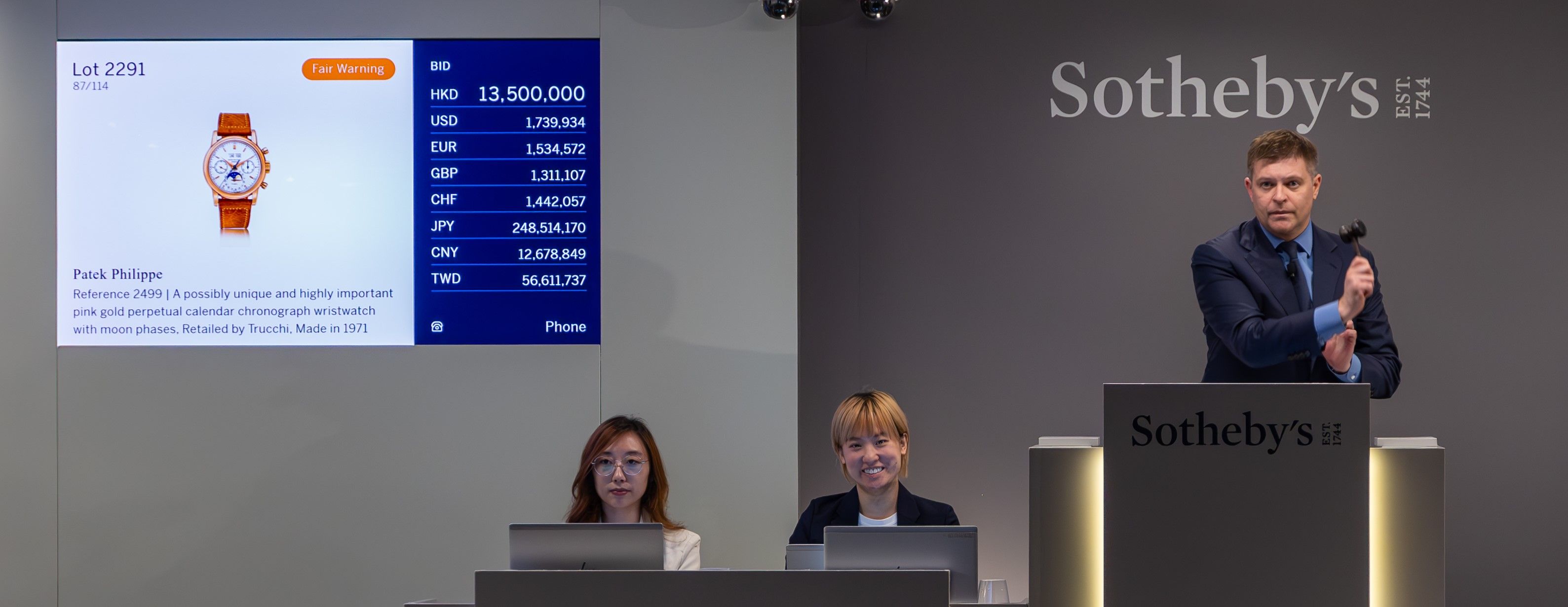 儘管今年大環境動盪,拍賣公司依然細心觀察市場趨勢選品以搶佔市場,香港蘇富比(Sotheby’s)日前舉辦的「珍貴名錶」拍賣創造佳績,總成交額達約688,203,490元 較去年同期增長逾三成,全場有4款拍品落槌價超過4000萬元,拔得頭籌是PP獨一無二的粉紅金型號2499萬年曆計時碼錶,以超過6800萬元的高價拍出。