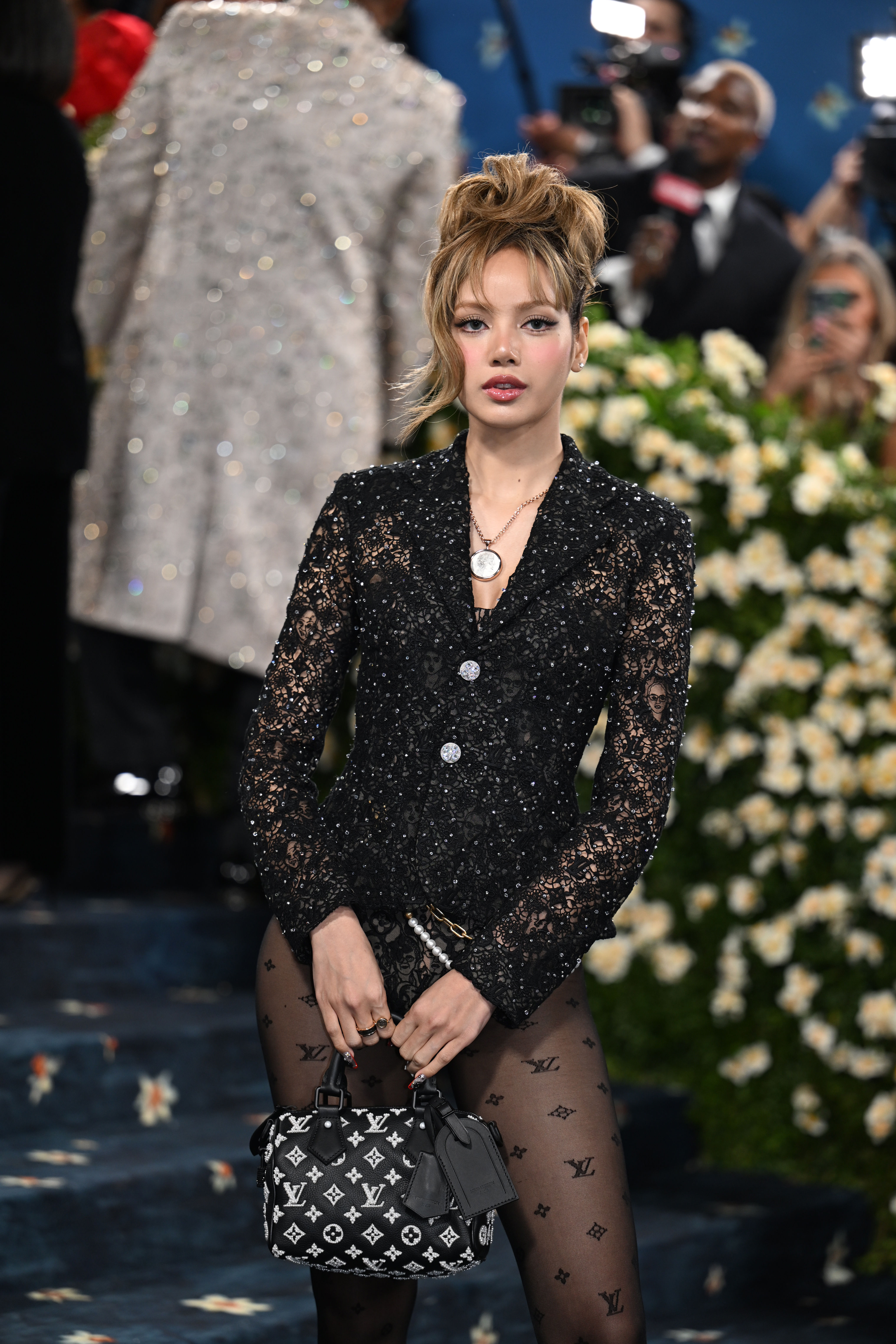 Lisa此次演繹Louis Vuitton 路易威登特別訂製的禮服,呈現了相當貼合身材的深V蕾絲西裝,體現可剛可柔的特質,並以華麗亮片水鑽進行詮釋,多了柔美和性感韻味,而視線移至下方幾乎是下衣失蹤的程度,以經典Monogram印花透膚絲襪和印有人物肖像的三角褲打底,露出Lisa修長美腿曲線,她拎著Speedy包款,搭配上復古韻味十足的捲髮瀏海與高盤髮,流露出與過往不同的氣息。