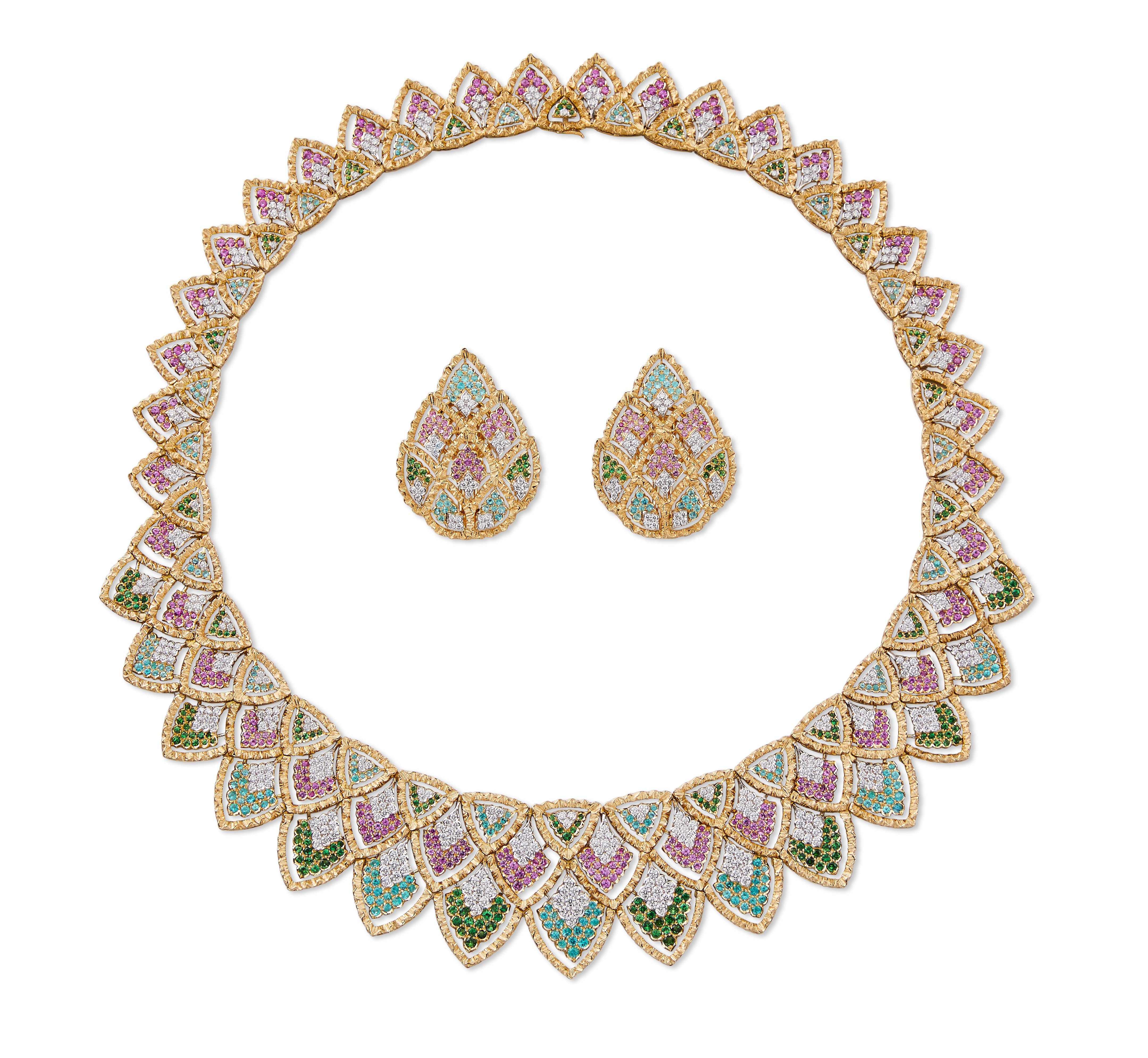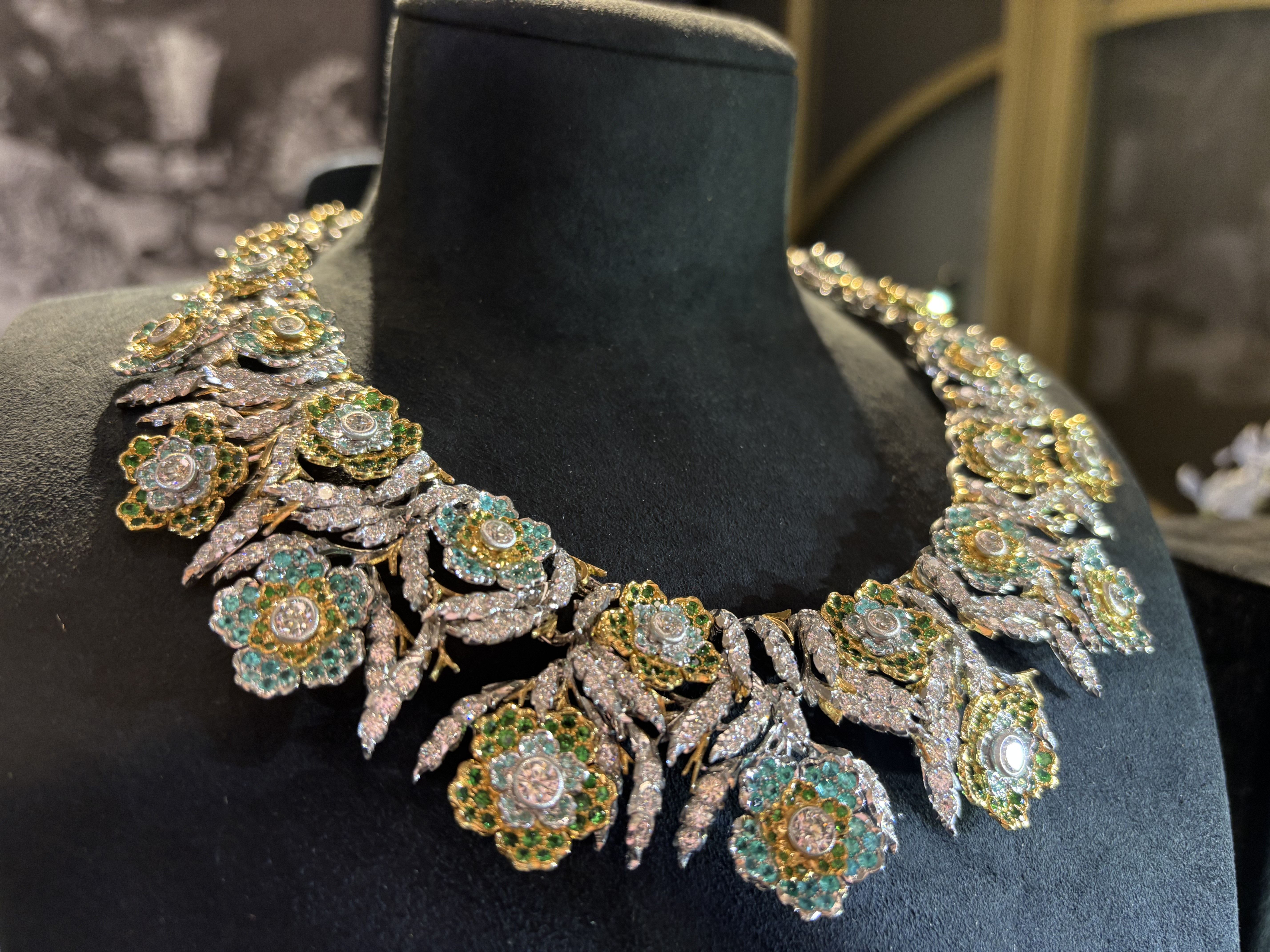 ▲BUCCELLATI第三代設計師Andrea Buccellati創作的 Il Giardino Di Buccellati系列項鍊,運用Modellato 雕刻技法與彩色寶石展現繽紛花園。(圖/記者陳雅韻攝)