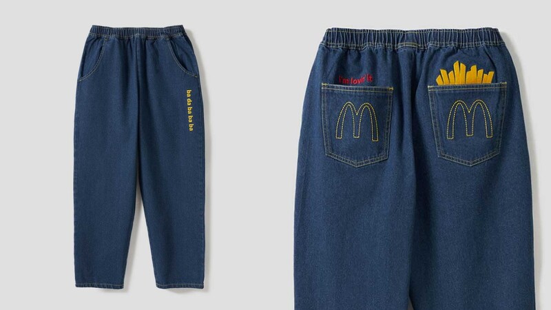 系列中的牛仔褲正面是大家熟悉的「吧拉吧吧吧~」標語,褲款背面則是本次設計重點,兩個後口袋都有麥當勞的M字母刺繡設計,右邊口袋則是藏著薯條作為童趣亮點,錐形褲的設計實穿好搭。