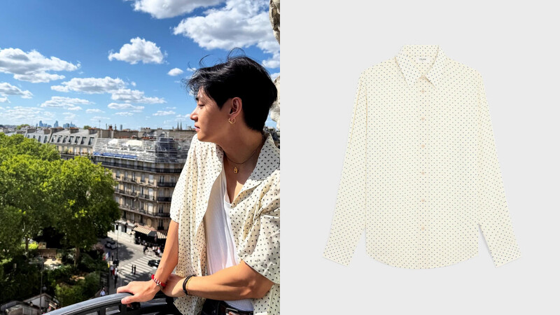最後,這款印花黏膠纖維寬鬆襯衫選以柔和米白為底,映襯以深藍TRIOMPHE Logo滿版印花,圖騰主題鮮明卻不失優雅,舒服材質搭配寬鬆剪裁,呈現自然垂感,設計巧思的Drugstore領與珍珠母貝鈕扣細節,在質感與功能上皆展現雙向兼備!