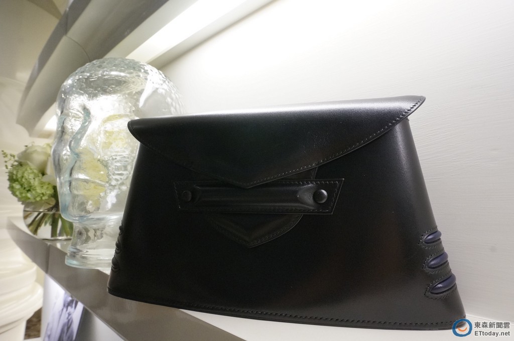 ▲這款黑藍拼接的立體酒桶造型小包,同樣極為獨特。(圖/記者張妤瑄攝)