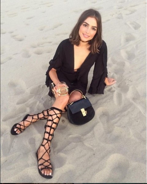 Olivia Culpo結合嬉皮風的自由不羈以及黑色的性感叛逆,將濃濃女人味完美融入嬉皮風格的穿搭中,除了低胸領口不經意地流露性感氛圍,更不忘穿上高筒羅馬鞋展現個性態度。
