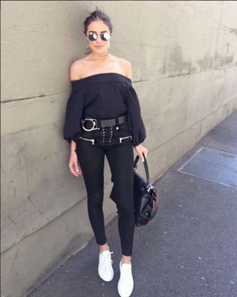 誰說街頭風格與性感是兩條平行線?Olivia Culpo戴上太陽眼鏡與球鞋之餘,穿上了黑色平口上衣小露香肩,並且不忘為衣著增添重點,在腰間掛上了個性感的腰帶,完美將街頭潮流穿出性感風味。