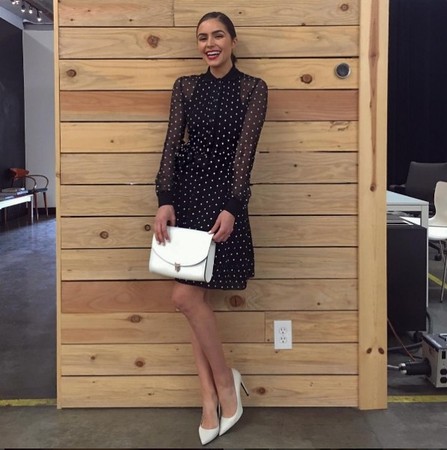 Olivia Culpo穿上一身黑色薄紗點點洋裝,簡單搭配白色的尖頭高跟鞋以及手拿包,看起來氣質大方又不失時髦個性。