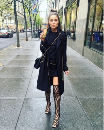 想要當性感的酷妹,你不妨像Olivia Culpo一樣穿上全黑的連身短褲以及長外套,頭上綁顆個性十足的半包頭,再選擇一雙頗有女人味但又叛逆十足的及膝長筒羅馬鞋,讓全黑裝束展現性感帥勁。