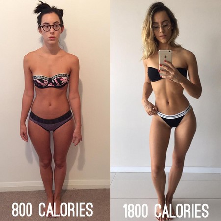Madalin Frodsham 一開始選擇用節食的方式來瘦身,一天只攝取800大卡,後來完全沒成功(左下圖),經過營養師的指導,她以攝取碳水化合物和運動來減肥,成功後雖然體重沒有減少,但從體態上來看身材變得非常勻稱(當然~人家是有認真在運動健身的,不要以為多吃碳水化合物就能瘦啊...)
