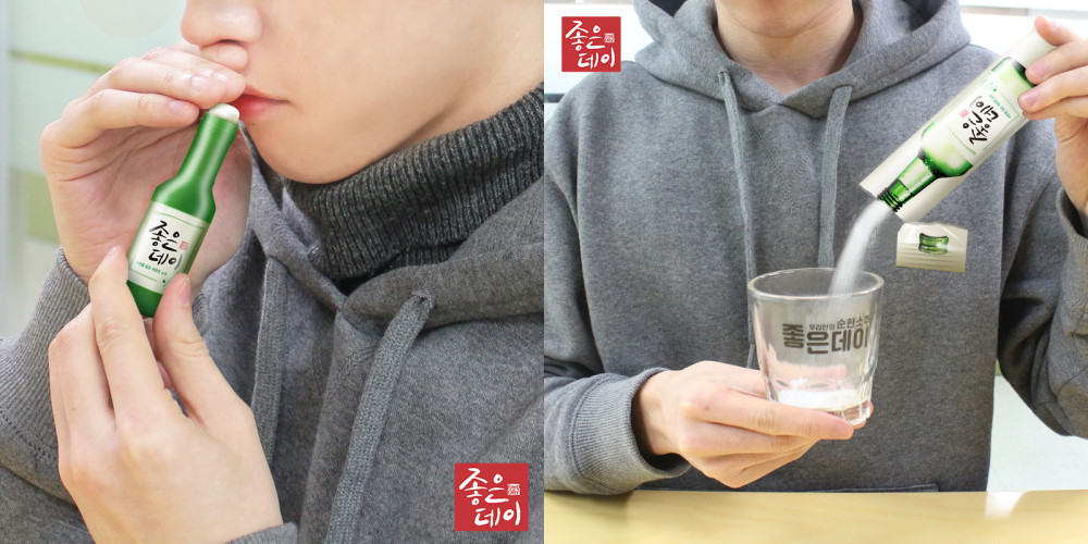 ▲燒酒護唇膏、即沖燒酒粉,創意無限南韓人。(圖/翻攝自좋은데이臉書)
