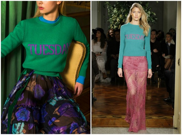 浪漫主義的Alberta Ferretti,這次在2017秋冬秀上除了唯美優雅風格,也大玩色彩,設計七款「星期」毛衣的Rainbow Week系列,繽紛歡樂,打破以往對Alberta Ferretti印象。設計師Alberta Ferretti更是俏皮地說,因為自己常忙到忘記星期幾,不如就把「今天星期幾」穿在身上,這樣就不會忘記了!