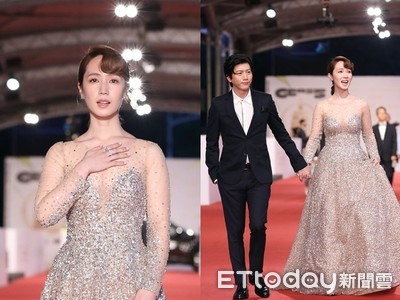 第55屆金鐘獎紅毯,演員小薰身穿知名黎巴嫩設計師Tonyward的設計,價值50萬,金色的透膚穿搭搭配胸前的金色閃鑽展現出奢華浪漫的感覺..