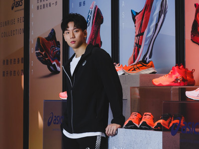 運動品牌ASICS 2021年首發SUNRISE RED系列鞋款,於今(13日)請到有台灣「蝶王」之稱的泳將王冠閎演繹,頂著出眾顏值,王..