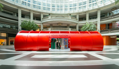 LOUIS VUITTON(LV,路易威登)進駐信義區BELLAVITA寶麗廣場中庭,開幕秋冬女裝快閃店,大大的紅色水管型外觀,從遠處看..