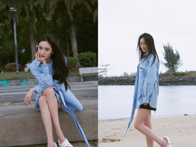 大陸女星楊冪筆直美腿已成招牌,近日工作室曝光一系列海灘美照,楊冪穿著襯衫搭配短褲,以「下衣失蹤」的方式大秀白皙長腿,不過卻發現他腳踩一雙..