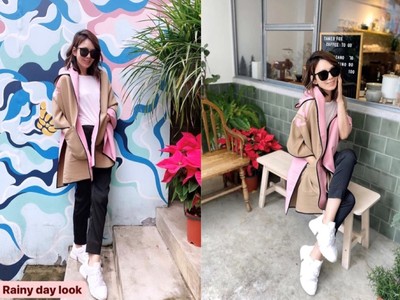 雨天該怎麼穿真的很惱人,一般人大概都會選暗色系的服裝或鞋子,濺到髒水比較不心疼,但「時尚媽咪」Melody反其道而行,披上米色與粉色的B..
