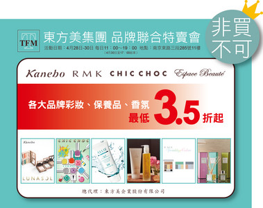 東方美集團將在28日起舉辦為期兩天的特賣活動,也是集團歷年來首次的特賣會,包括旗下美妝品牌Kanebo、RMK、CHlC CHOC與香氛..