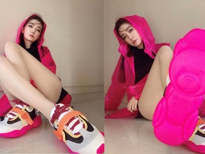 Moschino近日推出泰迪運動鞋系列,鞋底由最初的黑白色調,換裝成為超搶眼的霓虹螢光色系,「姐姐」謝金燕搶先入手螢光粉的款式,她不僅大..