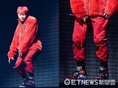 韓流巨星G-Dragon(GD)來台開唱,一身紅吱吱服裝超喜氣,紅色毛絨外套與紅髮相襯,不過眼尖潮人注意的是GD腳上潮鞋,來自NIKE與..