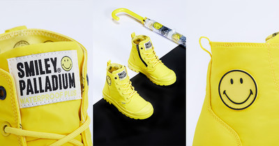 有70年歷史的法國軍靴品牌PALLADIUM,連續三年與SMILEY微笑商標打造聯名靴款,2019首度推出橘標防水聯名靴型,正適合大小雨..