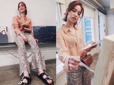 名模出身的陳庭妮到畫室作畫,連穿著打扮都講究,穿著褐色襯衫搭配應花寬褲,腳上穿的是法國名牌鞋履Roger Vivier Strass B..